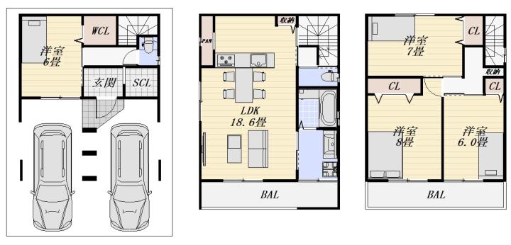 普通乗用車が2台、並列で停められます。インナーガレージですので、雨の日でも濡れずにお家に入ることができます。