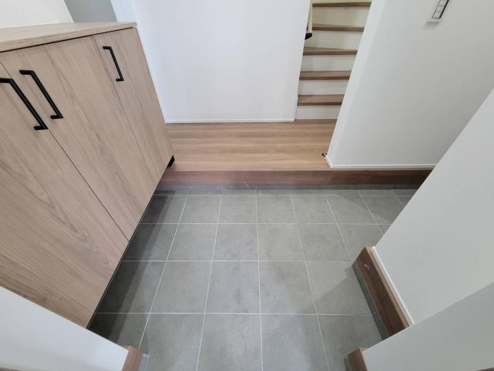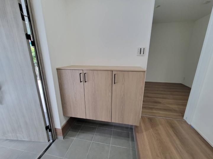玄関の横には大容量のシューズボックスがあります。靴だけではなく、コートやレインコートなどが掛けられるハンガーパイプも設置しました。