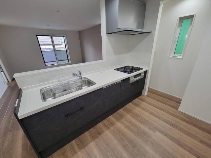 おしゃれなメタル調のキッチンは、お子様やご友人と一緒にお料理ができるくらいの大きさです。