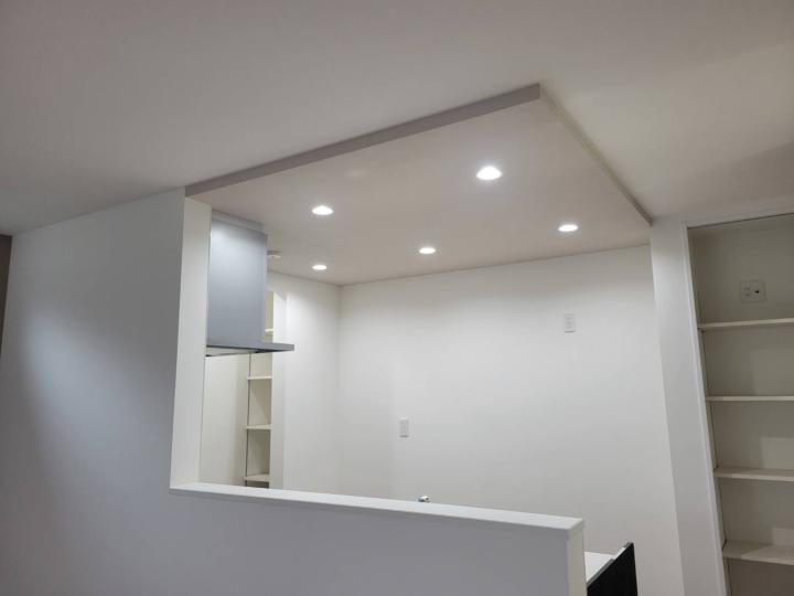 キッチン上部は折り下げ天井を施工し、ダウンライトも設置しました。